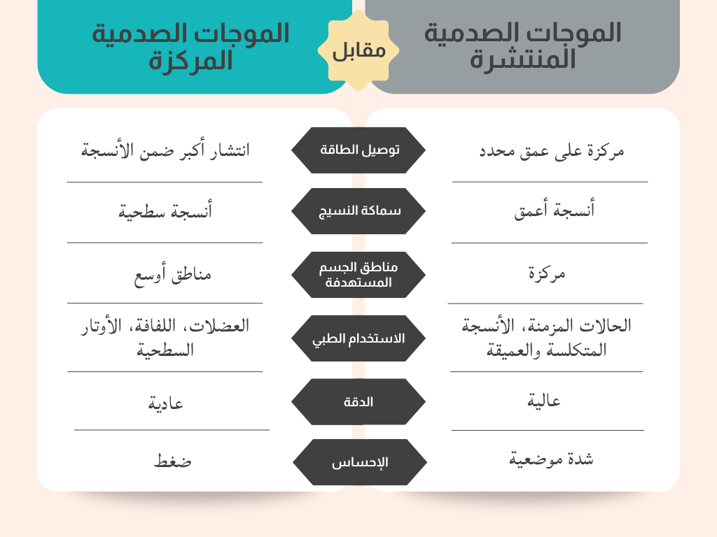 يعمل العلاج بالموجات التصادمية المُركَّزة على إيصال موجات صوتية تتجمع عند عمق محدد داخل الجسم، مما يسمح باستهداف دقيق للأنسجة والهياكل العميقة. وهذا يجعله مناسبًا بشكل خاص للحالات العضلية الهيكلية المزمنة أو الموضعية أو العميقة.
