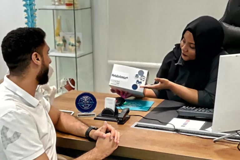نبدأ بتقييم تفصيلي قد يشمل التاريخ الصحي، ونمط الحياة، والعادات الغذائية، والأهداف الصحية. وعند الحاجة، نقوم بدمج فحوصات متقدمة مثل Genova Metabolomix+ للكشف عن الاحتياجات الوظيفية للعناصر الغذائية التي قد لا تظهر من خلال الفحوصات المخبرية التقليدية.