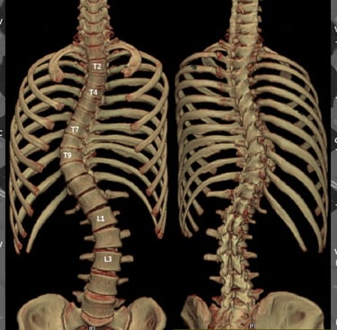 عند الانحناء إلى الأمام (مثل ربط الحذاء)، قد يبدو أحد جانبي القفص الصدري أو أسفل الظهر أعلى أو أكثر بروزًا من الآخر — وهي علامة شائعة على دوران العمود الفقري المرتبط بالجنف.