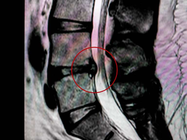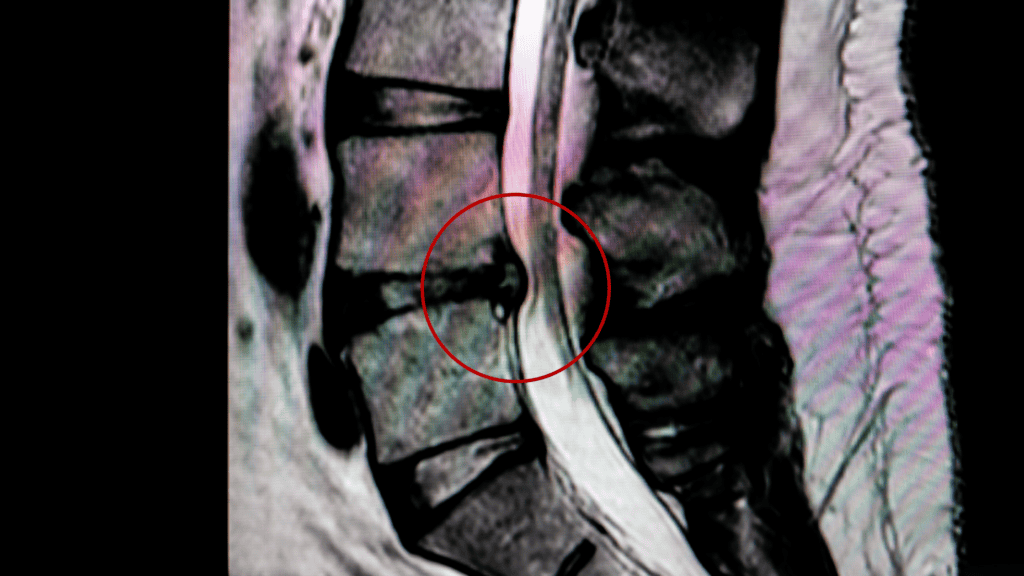 Lumbar disc bulges, herniations, or degenerative disc changes may place pressure on nerve roots that form the sciatic nerve, leading to radiating leg pain.