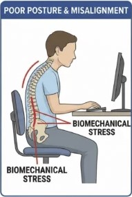 Abnormal spinal curves, poor posture, or pelvic imbalance can increase mechanical stress on the lower spine and nerve pathways, contributing to chronic sciatic symptoms.